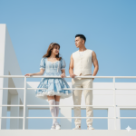 Body Movement & Pose: The man and woman stand together on a white balcony, facing the same direction (to the right from the camera’s point of view), with a bright blue sky in the background. The woman is on the left side (from the camera’s perspective), slightly bowing her head and turning toward the man with a gentle expression, her eyes looking at him. Her left hand lightly holds the balcony railing. The man stands on the right side, upright, with his right hand in his pants pocket and his left hand resting on the railing. He gazes in the same direction as the woman—toward the right side—with a calm expression. Their pose conveys a gentle, harmonious interaction in matching outfits.
