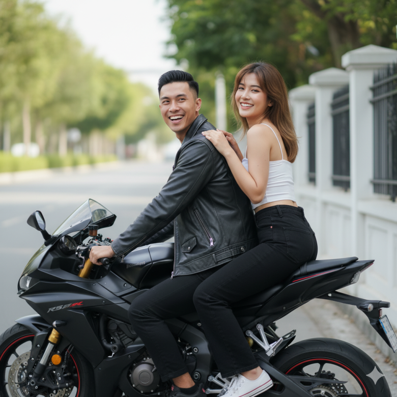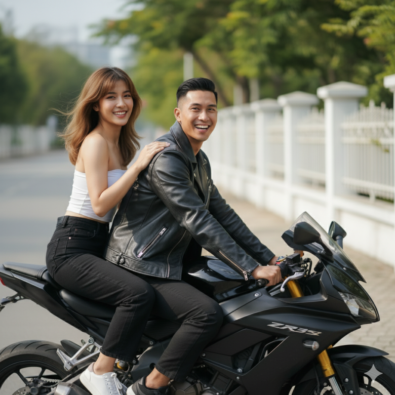 Make person in the picture, without changing original facial details. Gerakan & Pose Tubuh: Pria dan wanita duduk berpasangan di atas sepeda motor sport hitam di pinggir jalan. Pria berada di depan, memegang stang, menoleh ke belakang (ke sisi kanan), menatap kamera dengan senyum lebar dan ceria. Wanita duduk di belakang pria, tangan kirinya diletakkan di bahu pria, dan tangan kanannya rileks di samping tubuh. Ia menoleh ke belakang, menatap kamera dengan senyum lebar dan manis. Pose mereka menunjukkan kegembiraan, kebersamaan, dan petualangan yang menyenangkan. Outfit (Wanita): Atasan: Tanktop atau crop top ketat berwarna putih polos, dengan potongan strapless atau tali tipis yang tidak terlihat jelas. Bawahan: Celana jeans hitam dengan potongan lurus atau sedikit longgar, memiliki detail jahitan merah di bagian samping atau ujung celana (terlihat samar). Aksesori: Tidak ada aksesoris yang terlihat, fokus pada outfit kasual. Sepatu: Sepatu kets putih rendah (low-top sneakers) dengan sol putih. Outfit (Pria): Atasan: Kaus atau T-shirt hitam polos di balik jaket. Terusan/Outer: Jaket kulit hitam, dengan kerah standar dan ritsleting di bagian depan (sedikit terbuka). Jaket ini memiliki detail jahitan yang memberikan kesan edgy. Bawahan: Celana panjang hitam polos, berbahan katun atau jeans, dengan potongan lurus dan kasual. Aksesori: Tidak ada aksesoris yang terlihat. Sepatu: Sepatu kasual hitam atau sneakers gelap (tidak terlihat jelas). Suasana/Mood & Atmosfir Foto: Ceria, cool, dan penuh semangat. Suasana di luar ruangan di sebuah jalanan yang tenang dengan pagar beton putih bergaya klasik di sisi kanan dan dedaunan hijau di kejauhan. Mood-nya petualangan yang menyenangkan, dengan gaya rebel chic yang lembut. Camera Mirrorless Hasselblad X2D 100C: Lens: Hasselblad XCD 80mm f/1.9 Aperture: f/2.2 (untuk depth of field yang dangkal, fokus tajam pada subjek dan bokeh lembut di latar belakang jalan dan pagar) Shutter Speed: 1/250s (untuk membekukan gerakan dan menangkap senyum ceria) ISO: 200 (kondisi cahaya luar ruangan yang cerah) Perspektif Angle: Eye-level, sedikit ke atas, menatap subjek yang duduk di motor. Framing: Medium close-up, memotong di sekitar paha subjek, dengan fokus utama pada wajah dan tubuh bagian atas. Sepeda motor terlihat sebagian. Focus: Sharp focus pada wajah kedua subjek. Lightning: Setup: Natural light dari sinar matahari di siang hari. Quality: Terang dan merata, menghasilkan highlight yang jelas pada rambut, kulit, dan jaket kulit. Bayangan lembut namun terdefinisi. Direction: Matahari bersinar dari atas-depan, menerangi subjek secara merata. Cahaya memantul dari pagar putih, berfungsi sebagai fill light alami. Color: White balance netral, dengan warna-warna cerah dan jenuh (hitam, putih, merah, hijau). Composition: Rules: Garis diagonal dari sepeda motor dan garis horizontal dari pagar berfungsi sebagai leading lines yang mengarahkan pandangan ke subjek. Subjek ditempatkan di sepertiga kiri dan tengah frame. Negative Space: Cukup signifikan di bagian atas (langit/dinding putih) dan belakang (jalan), memberikan kesan lapang. Balance: Seimbang, dengan subjek mengisi sebagian besar frame dan sepeda motor menjadi elemen foreground yang kuat. Color Palette: Kontras kuat antara Hitam (jaket, celana, motor) dan Putih (atasan wanita, pagar, sepatu), dengan sentuhan Merah (detail motor, jahitan celana) dan Hijau (dedaunan). Texture Detail: Terlihat jelas pada kilau jaket kulit, tekstur denim celana, dan detail mesin motor. Arah Angin: Angin sepoi-sepoi yang lembut menyebabkan beberapa helai rambut panjang wanita sedikit bergerak dan berkibar. Art atau Efek pada Gambar: Fine art photography dengan sentuhan editorial yang stylish dan energik. Warna-warna cerah dan kontras yang kuat, skin tone natural dan bercahaya. Gambar memiliki kejernihan dan ketajaman yang luar biasa. Fokus pada kegembiraan, couple fashion, dan suasana petualangan.