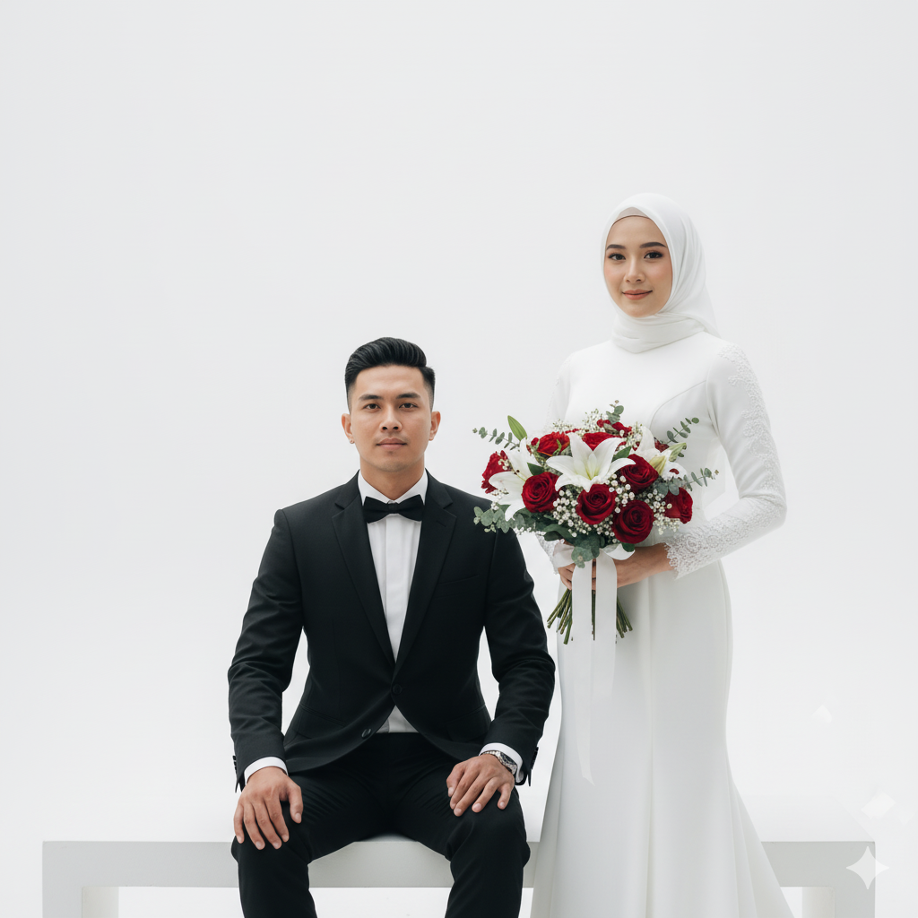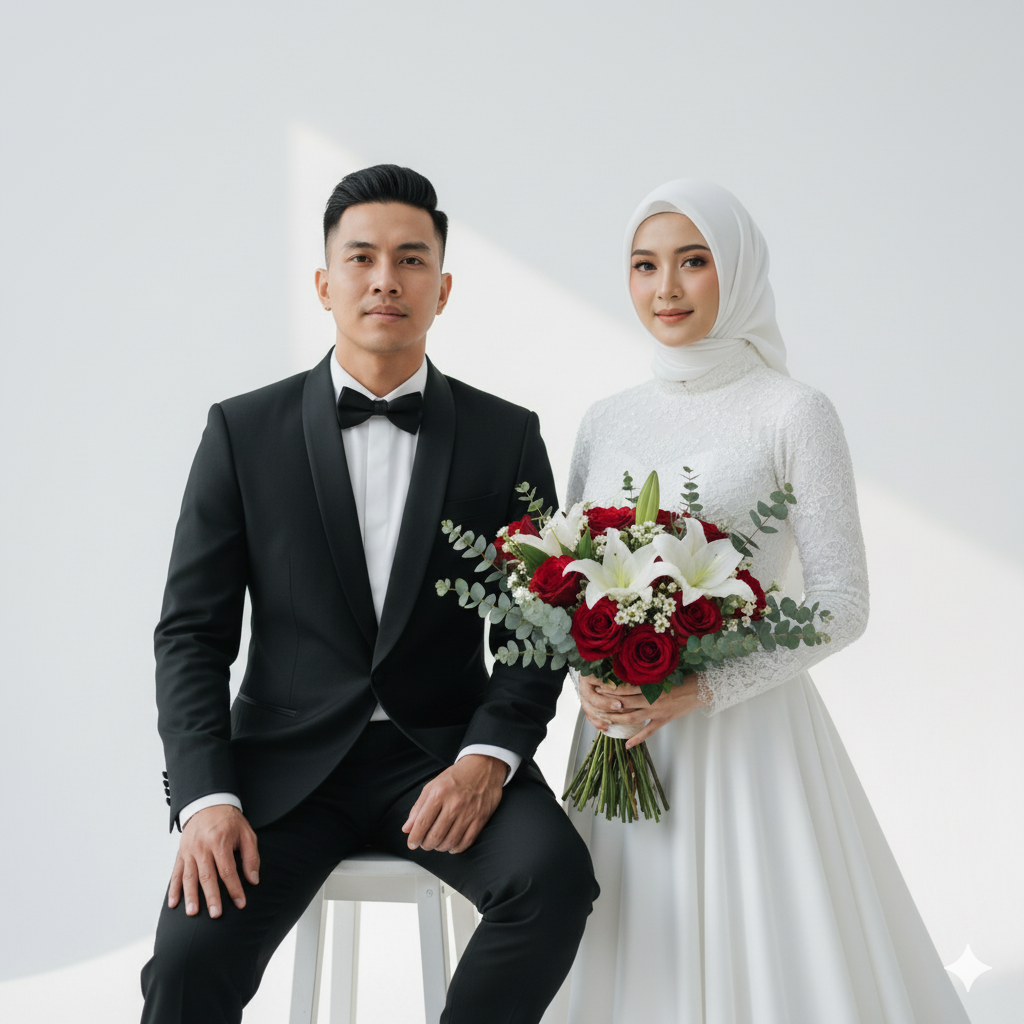 The other stands beside them in a white long-sleeved modest wedding gown and a white hijab, holding a large, vibrant bridal bouquet of red roses, white lilies, and other flowers.