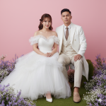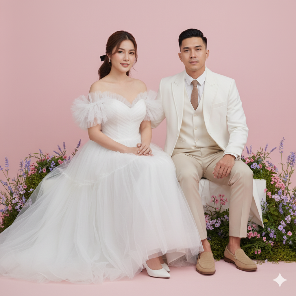 Composition: Rules: Subjects fill the center of the frame. Flowers in the foreground and background create gentle visual framing. Negative Space: Soft pink background and blurred (bokeh) flowers serve as clean and beautiful negative space. Balance: Balanced, with the man and woman creating a harmonious composition. Color Palette: Soft pastel tones (White, Beige, Soft Pink, Light Purple). Texture Detail: Clearly visible in the layered tulle of the gown, the smooth fabric of the man’s blazer, and the flower petals. Wind Direction: No indication of wind; hair and clothing remain still.