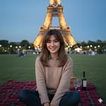 The final composition should appear lifelike, detailed, and of professional photographic quality. She sits on a plaid blanket at Champ de Mars, the Eiffel Tower glowing gold behind her. A bottle of wine, and the sound of accordion music drifting in the air.