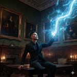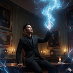 Make person in the picture ultra realistic without changing original facial details. A young adult man seated in some chairs, indoors, likely in a richly decorated room, and appears to be conjuring or interacting with intense blue, electrical-looking energy. The man is positioned in the center-left of the image, seated on what looks like a large, dark wooden table or piece of furniture. He is wearing a formal black suit, including a jacket, and trousers which suggests an upper-class or traditional setting. His posture is dynamic: he is leaning slightly back, looking upward and to the right, with his right hand raised, palm open and facing up, directly into a stream of bright, luminous massive blue energy that emanates from his hand and rises toward the top of the frame, resembling smoke, fire, or plasma and then spreads everywhere massively throughout the room
