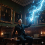 Make person in the picture ultra realistic without changing original facial details. A young adult man seated in some chairs, indoors, likely in a richly decorated room, and appears to be conjuring or interacting with intense blue, electrical-looking energy. The man is positioned in the center-left of the image, seated on what looks like a large, dark wooden table or piece of furniture. He is wearing a formal black suit, including a jacket, and trousers which suggests an upper-class or traditional setting. His posture is dynamic: he is leaning slightly back, looking upward and to the right, with his right hand raised, palm open and facing up, directly into a stream of bright, luminous massive blue energy that emanates from his hand and rises toward the top of the frame, resembling smoke, fire, or plasma and then spreads everywhere massively throughout the room