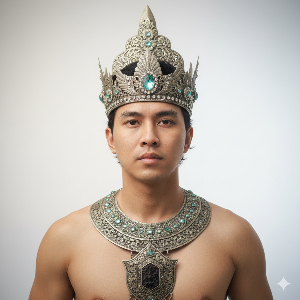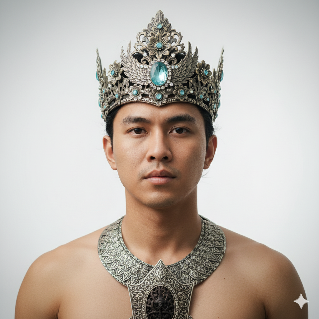 Make person in the picture, without changing original facial details. A real-life, fine art photograph of a young Indonesian man, portraying Raden Wijaya. Movement & Pose: The man is completely still, facing directly forward, with a calm yet resolute expression. His shoulders are slightly back, suggesting a regal posture. There is no dynamic movement, emphasizing his stoic presence. Outfit (Upper Body): He wears an elaborate, ancient Javanese-inspired crown and a matching intricate necklace. Crown: The crown is multi-layered and appears to be crafted from silver or a similar light-colored metal, with an oxidized, antique finish. The base of the crown features delicate, leaf-like motifs and small, rounded embellishments. Above this, the crown rises into several tiers, each adorned with floral patterns, stylized wings, and swirling filigree. Centered on the forehead is a prominent, light blue or aquamarine gemstone, possibly a faceted sapphire or topaz, surrounded by smaller, clear crystals. Smaller, light blue gemstones are strategically placed throughout the crown, adding subtle glints of color. The very top of the crown culminates in a pointed, finial-like structure. Necklace: A broad, multi-layered necklace rests on his bare chest. It mirrors the metallic sheen and intricate detailing of the crown. The main part of the necklace is a wide band of metalwork, featuring repeating patterns of small, textured scales or overlapping plates. In the center, a large, ornate medallion hangs, shaped like a stylized shield or crest, with a dark, possibly carved, centerpiece. The entire necklace is made of the same antique silver-toned metal, reflecting a rich, historical aesthetic. Hair: The man’s hair is neatly styled and pulled back, completely hidden beneath the crown, except for a few wisps at the temples that are slightly visible. The hair should maintain the original shape and style from the reference image, appearing dark and slightly wavy. Atmosphere & Mood: The atmosphere is serene, reverent, and slightly mystical, evoking a sense of ancient history and quiet power. The mood is solemn, dignified, and contemplative, yet with an underlying strength. Camera & Lens: Hasselblad X2D 100C with a Hasselblad XCD 80mm f/1.9 lens. Aperture: f/2.2 (for shallow depth of field, isolating the subject and creating a dreamlike quality). Shutter Speed: 1/125s (to ensure sharp focus without motion blur). ISO: 100 (for maximum image quality and minimal noise). Perspective Angle: Eye-level, directly head-on. Framing: A tight headshot to upper chest, emphasizing the facial details and the intricate crown and necklace. Focus: Pin-sharp focus on the man’s eyes and the details of his face, with a gradual fall-off into soft blur for the background. Lighting: Setup: Studio lighting with a large softbox as the key light positioned slightly to the left and above the subject, providing soft, diffused illumination. A smaller fill light is placed directly in front of the subject, at a lower intensity, to gently lift shadows. A subtle hair light/rim light from behind and above, slightly to the right, to highlight the edges of the crown and shoulders. Quality: Soft, diffused, and even. Direction: Predominantly frontal with a slight overhead bias from the key light, creating soft shadows under the chin and brow. The rim light creates a subtle glow around the subject. Color: Neutral daylight color temperature, clean and crisp, enhancing the metallic tones of the accessories. Composition: Rules: Rule of thirds applied loosely, with the man’s eyes placed roughly on the upper horizontal third line. Strong central symmetry in the overall pose and framing. Negative Space: Ample negative space around the subject, with a clean, light background to ensure the focus remains entirely on the man and his adornments. The background is a very light, almost white, gradient that subtly shifts from slightly warmer at the top to cooler at the bottom, mimicking a studio backdrop. Balance: Perfect symmetrical balance. Color Palette: Dominated by shades of silver, gray, and muted gold from the accessories, contrasted with the natural skin tones of the subject. The small blue gemstones provide a subtle cool accent. Texture Detail: Exquisite detail on the metallic filigree, the individual scales of the necklace, and the slight imperfections on the antique metal, contrasted with the smooth texture of the skin. Wind: No discernible wind. The hair and outfit remain perfectly still, reinforcing the stoic and timeless quality of the portrait. Art/Effects: Fine art photography aesthetic. Soft Glow: A very subtle, ethereal soft glow emanates from the crown and parts of the metallic necklace, giving them a slightly magical or historical aura without looking artificial. Subtle Vignette: A very gentle, almost imperceptible vignette around the edges of the frame to draw the eye towards the center. Color Grading: A slightly desaturated yet rich color grade, emphasizing the metallic tones and natural skin, with a hint of warmth. Negative Prompts: Not CGI, not anime, not cartoon, not painting, not sketch, not drawing, not illustration, not 3D render, not sculpture, not action figure, not doll, not comic, not vector, not game art, not digital art.