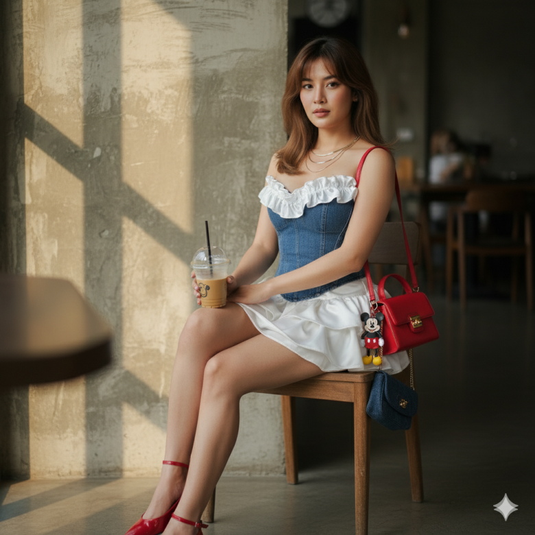 Outfit: A denim strapless corset top trimmed with white satin ruffles along the bust line, paired with a short white puffed satin layered skirt.