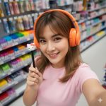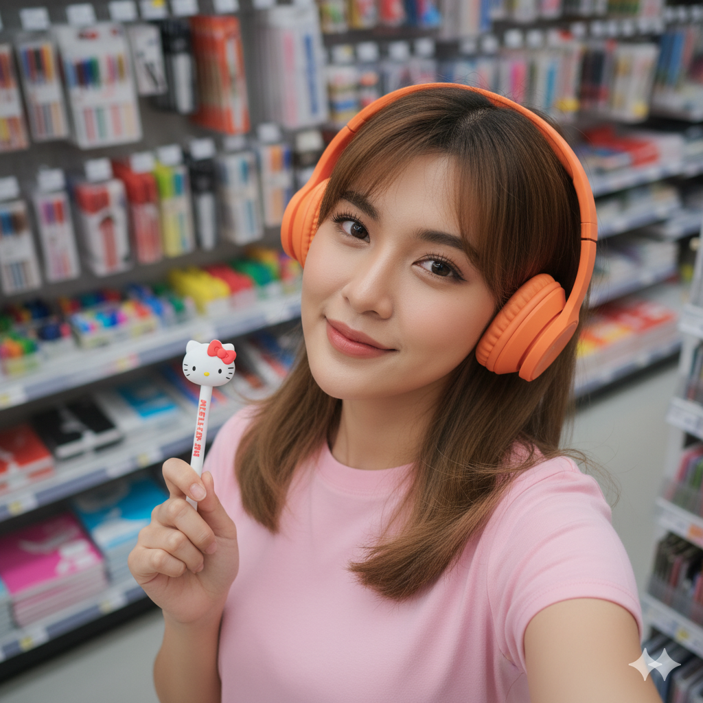 A high-angle, close-up selfie of a young East Asian woman in a stationery store. She wears a pink t-shirt and orange headphones, looking up at the camera with a cute smile. She is holding a pen with a Hello Kitty topper towards the camera. The store’s aisles, filled with colorful pens, are blurred in the background. Use the attached image as the subject.