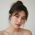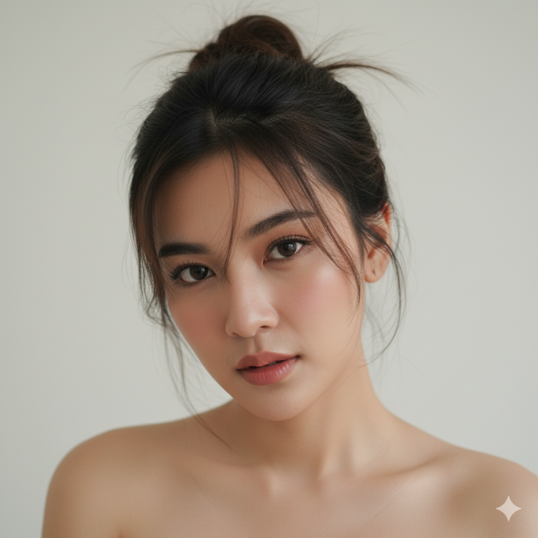 Make this image a candid, close-up selfie of a woman with a very fair, rosy complexion. She has a sultry, sleepy, or pensive expression, with a slight pout and heavy-lidded gaze, her dark, messy updo framed by flyaway strands. Her head is tilted down and to her right. She shirtlss, solid light background. The ambient lighting is gentle, giving the image a soft focus and an intimate, fresh-faced aesthetic. Don’t change face