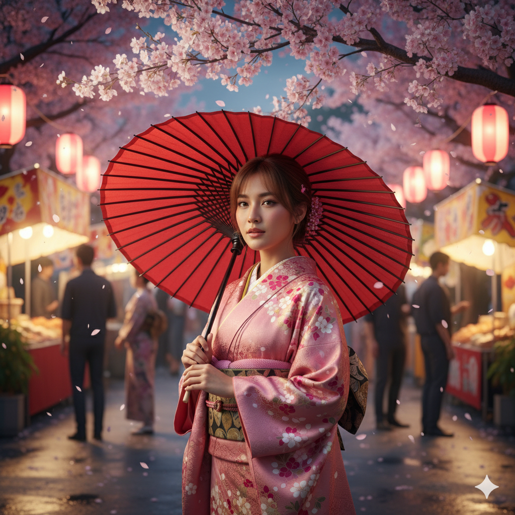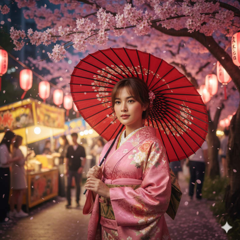 Create an ultra-realistic image of myself wearing a beautiful Japanese kimono with pink silk floral patterns. She holds a red paper umbrella in her right hand beneath blooming cherry blossoms at night. Soft pink petals float in the air, illuminated by warm lantern light and a festive background with blurred people and stalls.