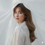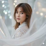 Dont change face. Copy my face and create A close-up, high-fashion portrait of a young woman with long, looking over her shoulder directly at the viewer. She has a delicate, ethereal expression with subtle makeup, featuring soft pink lips and defined brows. She is wearing a light-colored, possibly white or silver, delicate long blouse, and is enveloped by translucent.