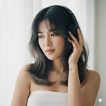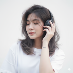 Gerakan & Pose Tubuh: Wanita ini terlihat santai namun elegan. Ia sedikit mencondongkan kepalanya ke arah bahu kanan (dari sudut pandang kita), dengan ekspresi mata yang lembut dan sedikit tertutup, seperti sedang menikmati musik atau momen. Tangan kanannya (dari sudut pandang kita) memegang erat earcup headphone di telinga kanannya, dengan jari-jari yang lentik dan posisi yang anggun, seolah menopang kepala atau memegang erat untuk menikmati suara. Lengan kirinya tidak terlihat, menyiratkan bahwa ia mungkin sedikit bersandar atau berpose menyamping.