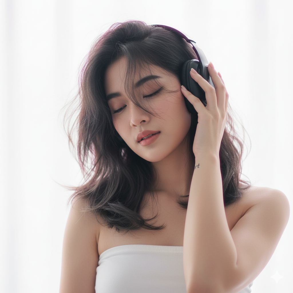 Gerakan & Pose Tubuh: Wanita ini terlihat santai namun elegan. Ia sedikit mencondongkan kepalanya ke arah bahu kanan (dari sudut pandang kita), dengan ekspresi mata yang lembut dan sedikit tertutup, seperti sedang menikmati musik atau momen. Tangan kanannya (dari sudut pandang kita) memegang erat earcup headphone di telinga kanannya, dengan jari-jari yang lentik dan posisi yang anggun, seolah menopang kepala atau memegang erat untuk menikmati suara. Lengan kirinya tidak terlihat, menyiratkan bahwa ia mungkin sedikit bersandar atau berpose menyamping.