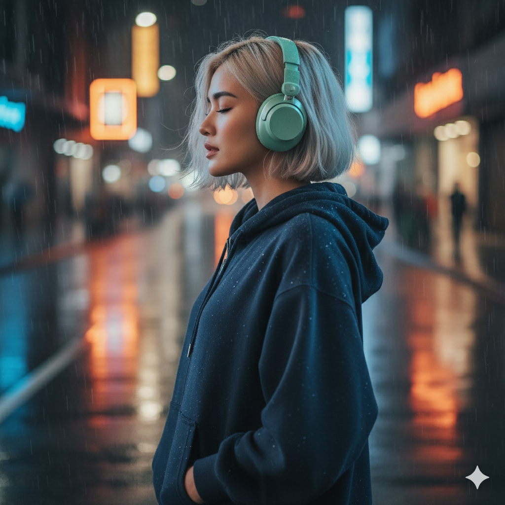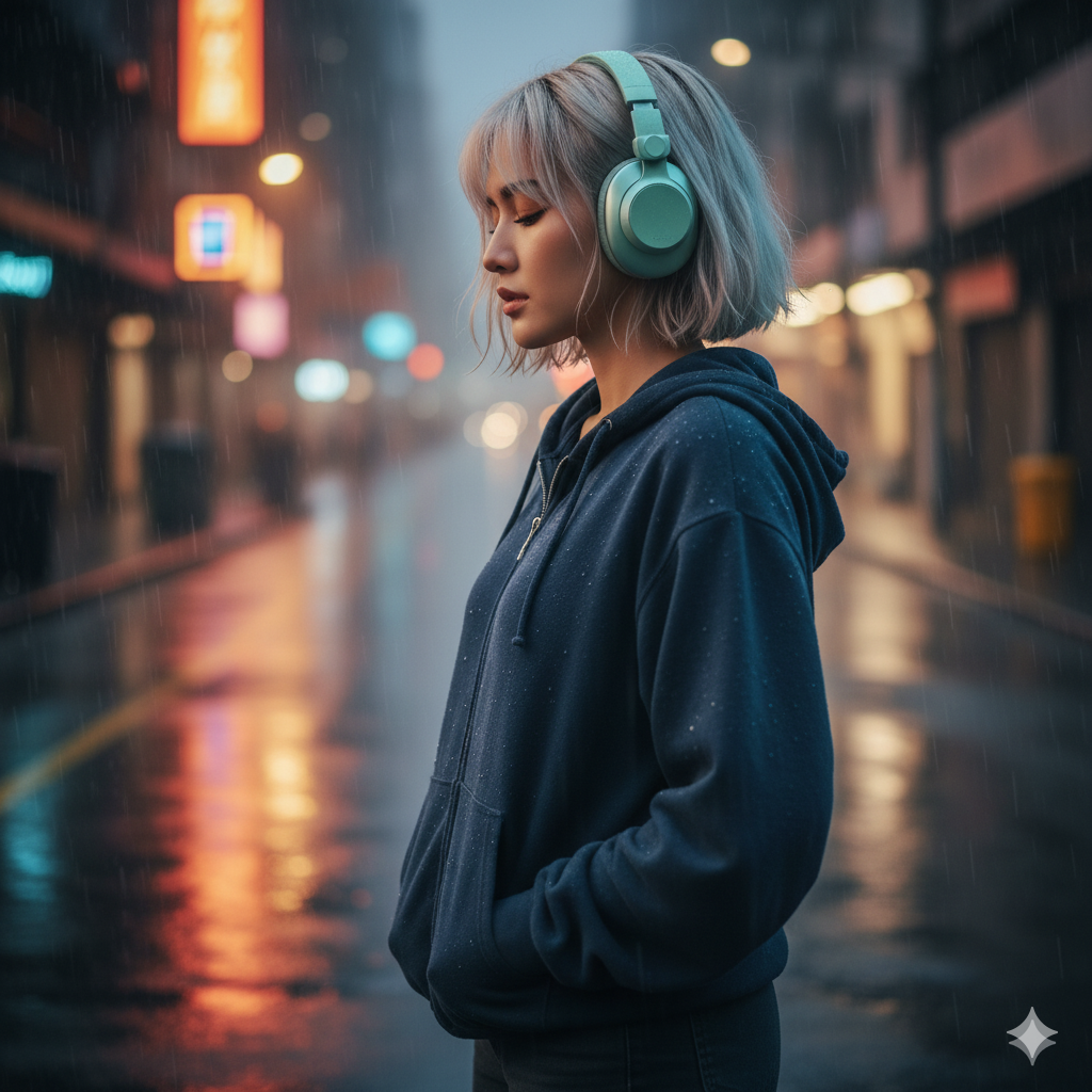 Accessories: No visible jewelry aside from the headphones. Atmosphere/Mood: Melancholy, peaceful, isolating, and highly atmospheric. The mood is quiet and introspective despite the busy setting.