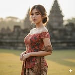 Make it realistic with an elegant and modern style. A brown batik shawl on both of her arms. Her body is slightly turned away from the camera. Her gaze is directed at the camera. Flawless makeup, natural red lips, pink blush.