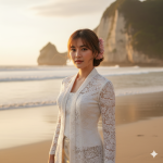 A woman who is wearing a white brocade kebaya complete with its songket.