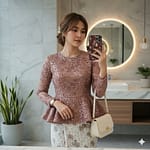 A woman wearing a mauve beaded long-sleeve peplum kebaya complete with a white batik songket, holding a small cream shoulder bag.
