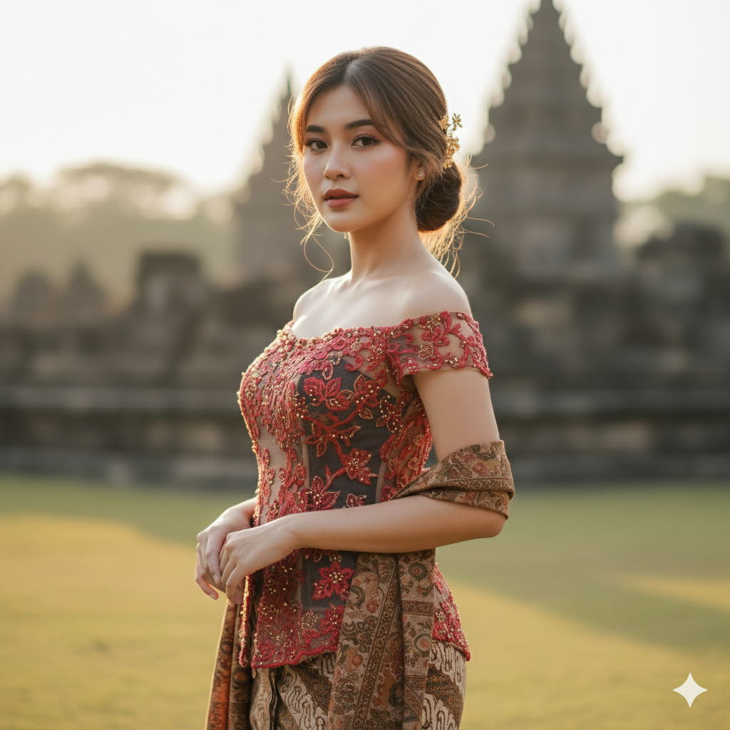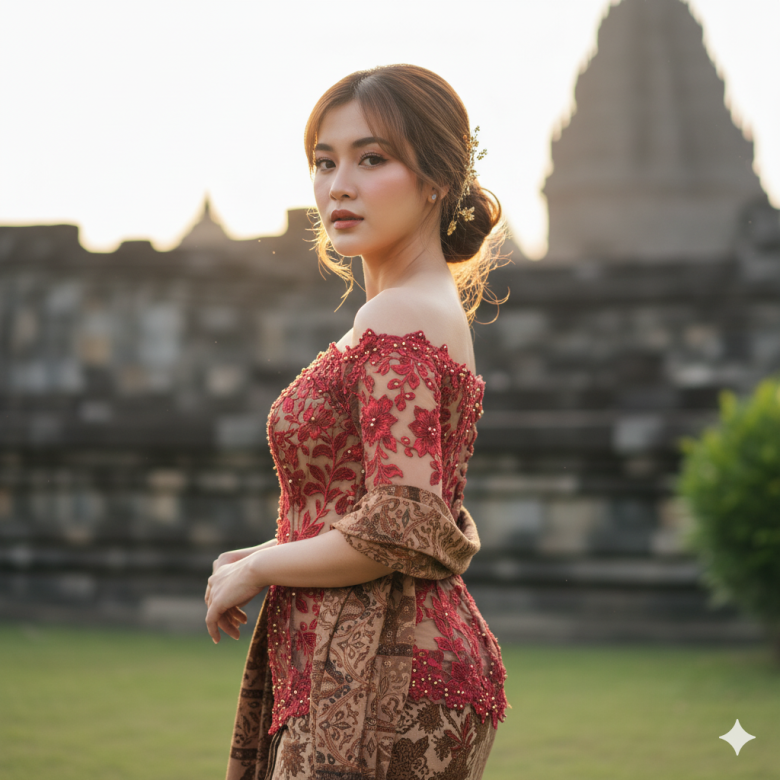 A woman is outdoors. She is wearing a modern brocade kebaya, short sleeves, off-shoulder neckline, body-fitting, with a transparent layer featuring intricate red floral patterns and gold beads.