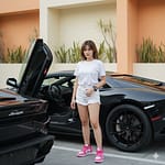 Create a photo with this face. A young Indonesian woman is standing near the door of a black Lamborghini sports car, with the driver’s door open in a scissor-style position. She is wearing a super tight white T-shirt and super short white jeans with frayed edges at the bottom, paired with pink Nike Air Jordan sneakers. She has a black digital watch with a thick frame on her wrist. Her hair is long, black, and styled in a messy bob.