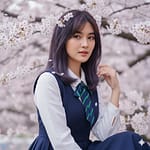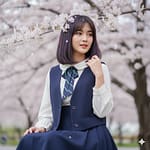 Angle: Slightly high-angle shot, a bit above the model’s eyes, giving a gentle impression and making the model appear slightly smaller amidst the cherry blossoms.