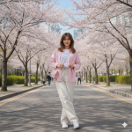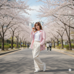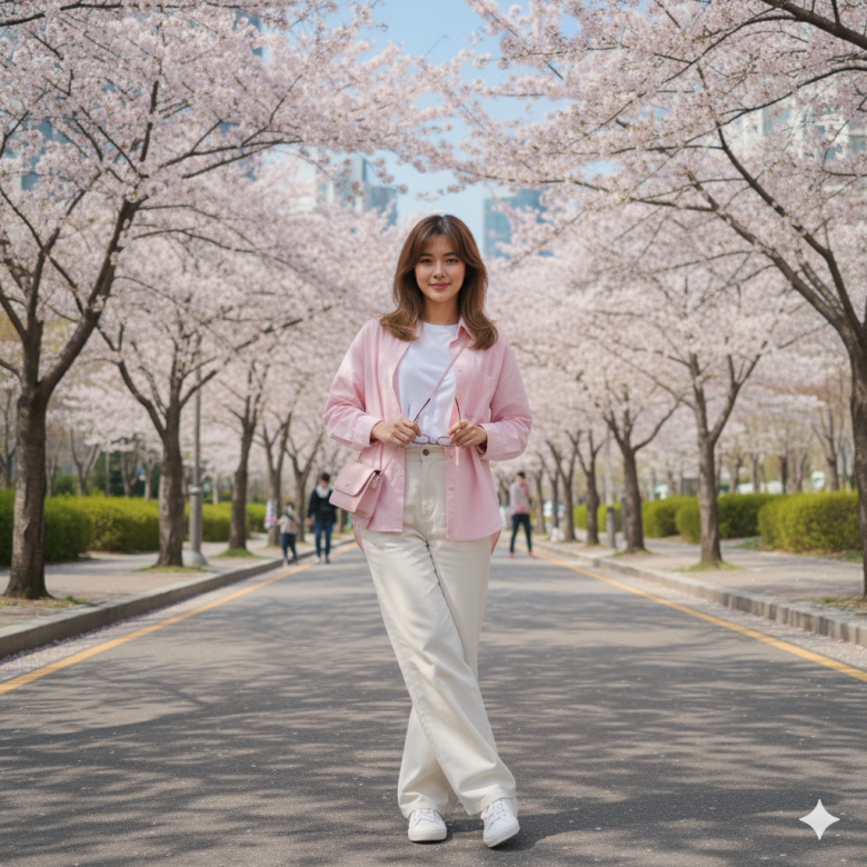 Background: on a quiet park road in Korea during spring, flanked by rows of fully blooming sakura trees on both sides of the road. The tree branches form a pale pink flower canopy above the asphalt road stretching straight ahead. The sky in the background is bright blue, while on the sides of the road there are neat green bushes. A few people can be seen walking leisurely in the distance, creating a peaceful, romantic, and iconic spring atmosphere similar to Japan. In the far distance, modern Korean-style high-rise buildings are also visible. In the middle of the road, there is a stylish young woman looking directly at the camera with a warm, romantic, and soothing expression — suitable for being shared on social media like stories.”