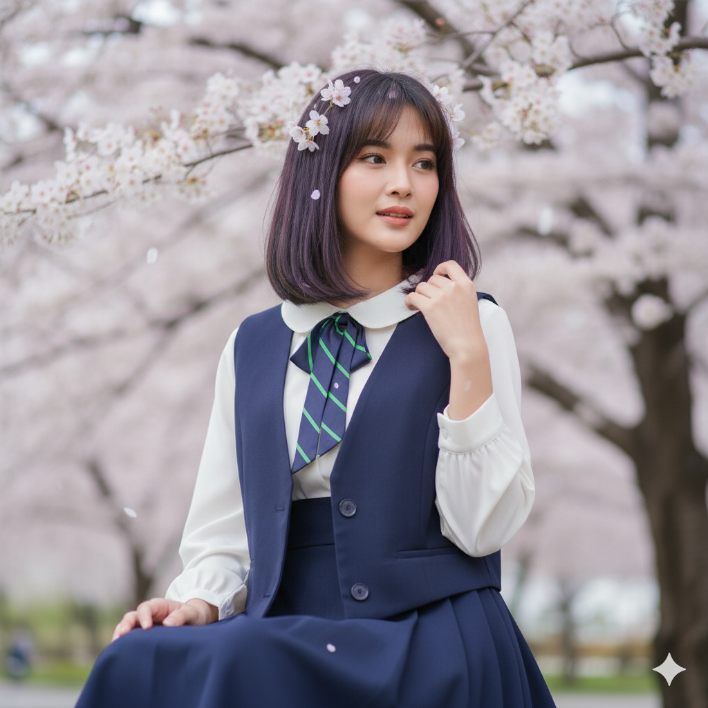 Wind Direction: Very gentle breeze from the front, just enough to slightly move some cherry blossom petals floating in the air or resting on the model’s hair and outfit, adding a natural and dynamic impression without disturbing the hairstyle.