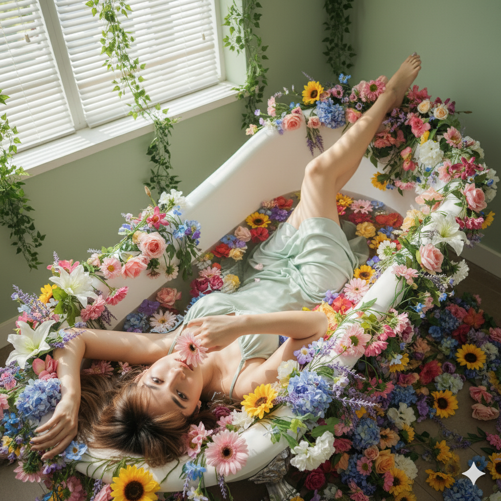 The bathtub is filled and surrounded by a lush abundance of colorful flowers, which also spill over the edges, naturally framing my figure. I’m wearing a pale mint-green or silvery slip dress made of soft, delicate fabric that drapes fluidly around my body. My pose feels serene yet whimsical—lying on my back, one hand gently holding a pink daisy near my lips. My bare feet rest among the vibrant flowers, while my dark, slightly tousled hair falls loosely around my face.