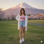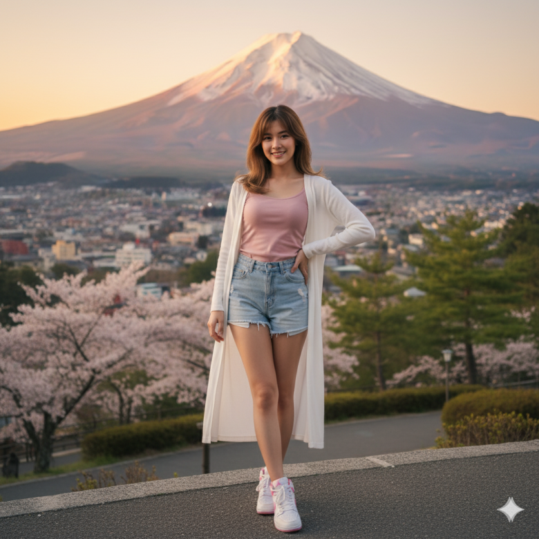 Create a hyper-realistic full-body 8K portrait that perfectly replicates the face from the uploaded image, with genuine facial expressions. One hand is holding her waist. Long, straight, wavy hair. The subject should wear an pink tank top layered with a white long cardigans, and super-short denim shorts that fall close to the thigh, white and pink Jordan sneakers, and look natural and match the surroundings. Make sure the pose feels relaxed and authentic, matching the clothing and the setting. The subject should be looking directly at the camera with a warm, sweet, charming smile. The final composition should be realistic, detailed, and of professional photography quality. Capture the golden moment of Mount Fuji in Japan, glowing in the sunset.