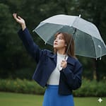 She is standing in the rain, facing slightly to the left side (from our point of view) and slightly turned forward. Her left arm is raised upward, with the palm open toward the sky as if catching raindrops, while her right hand holds the handle of a transparent umbrella.