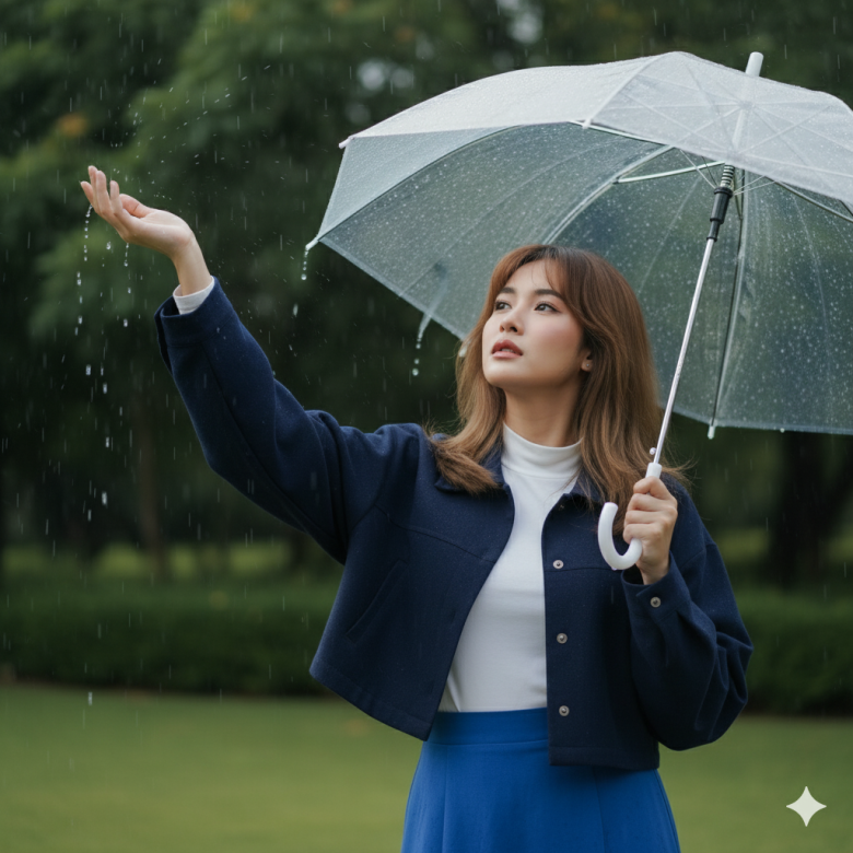 She is standing in the rain, facing slightly to the left side (from our point of view) and slightly turned forward. Her left arm is raised upward, with the palm open toward the sky as if catching raindrops, while her right hand holds the handle of a transparent umbrella.