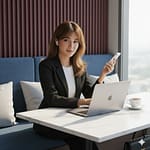 Sitting on a blue fabric-covered bench in a modern and classy office. She gives a slight smile toward the camera. She is wearing a stylish black business suit, showing a white inner shirt or top. On her right ear, white AirPods are visible. In front of her is a white marble table with gray patterns, where a silver MacBook Pro is partially open. On her right side, there is a white coffee cup with a bit of coffee left inside, placed on a small white saucer. She is holding a silver smartphone in her left hand, lifted slightly. Her right arm rests on the table near the laptop.