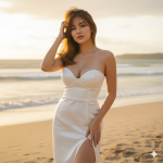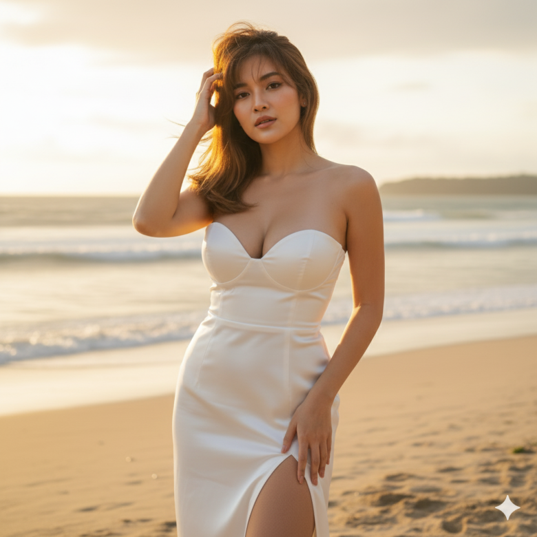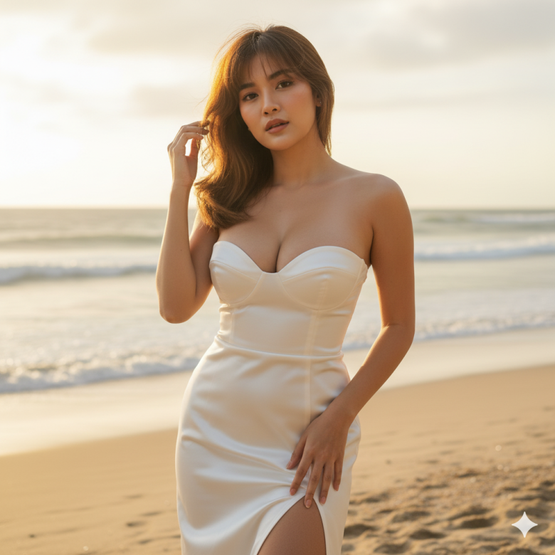 A photorealistic cinematic portrait of a woman, wearing an elegant pearl satin slip dress strapless, the color of her dress is same as in original photo. The top has a low-cut sweetheart neckline. She has voluptuous chest. Standing pose on a beach, one hand gently touching her hair, the other resting near her high slit dress, inense and captivating gaze, subtly seductive expression, confident aura.