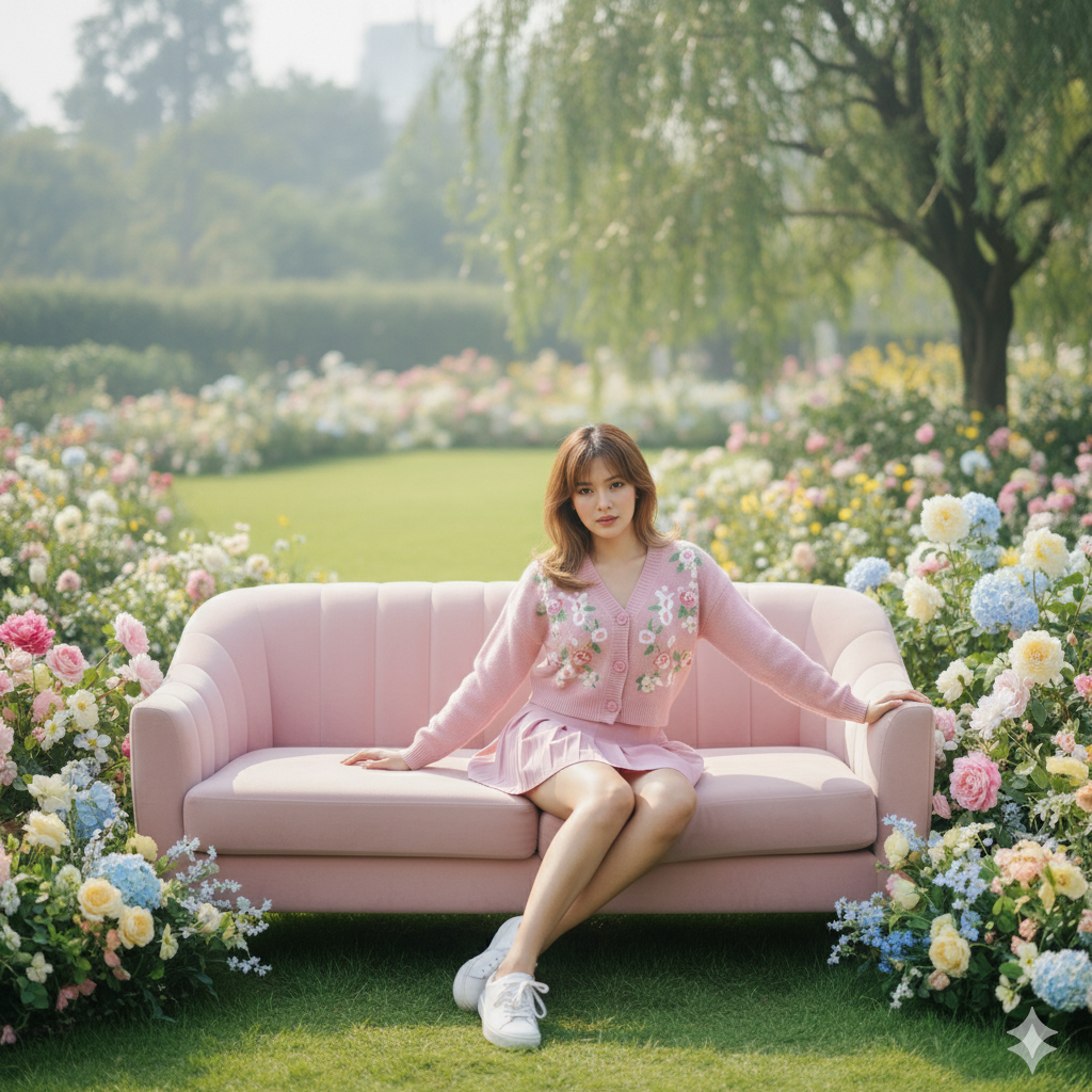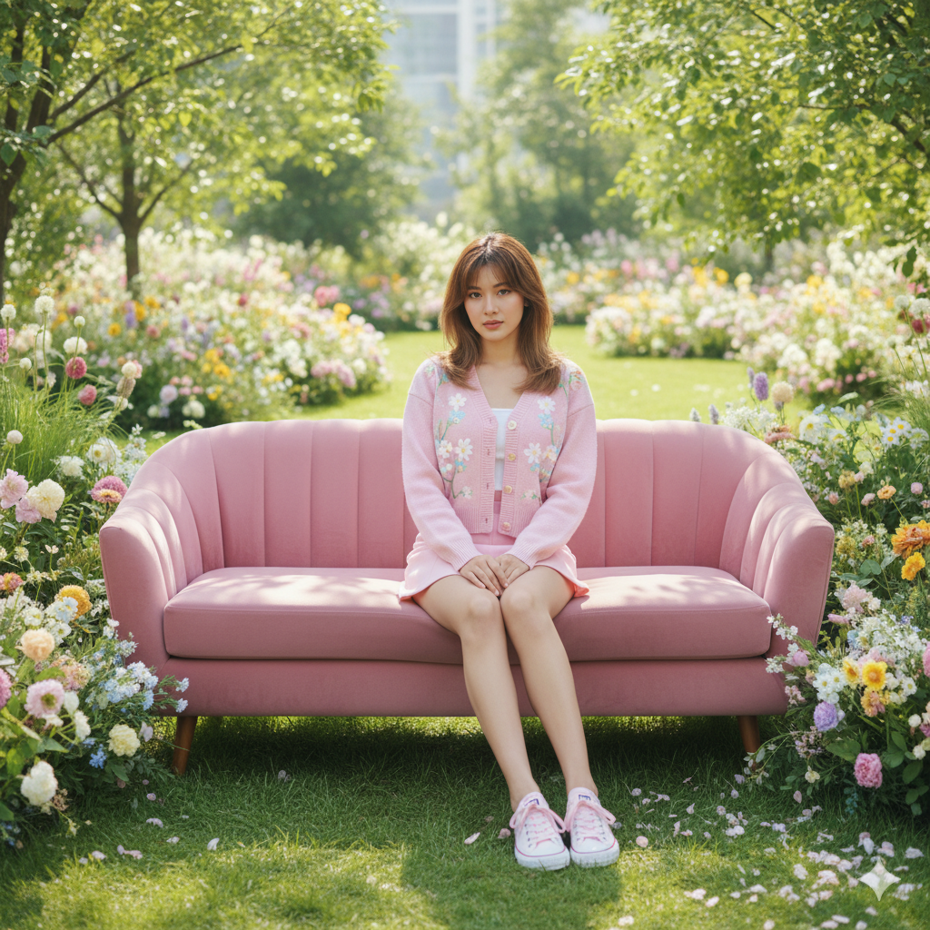 Make a young beautiful woman with my face wearing soft pink cardigan with floral embroidery, short pink skirt, and white sneakers, sitting elegantly on a pink sofa in a lush garden with green grass and blooming flowers, soft and dreamy lighting, serene and aesthetic composition, high detail, pastel color palette, cinematic photography style.