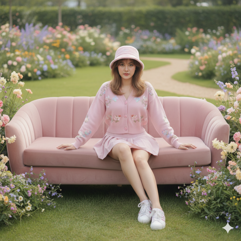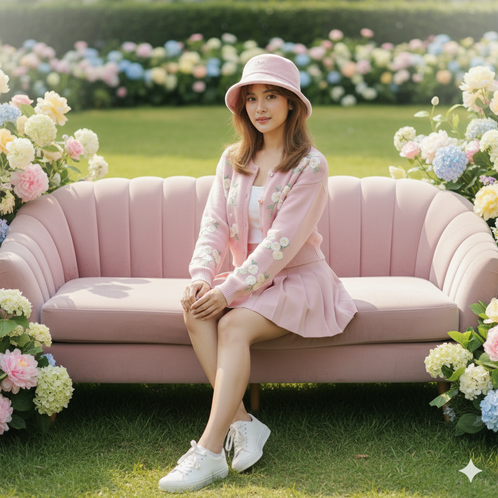 Make a young beautiful woman with my face. Soft pink bucket hat, soft pink cardigan with floral embroidery, mini pink skirt, and white sneakers, sitting elegantly on a pink sofa in a lush garden with green grass and blooming flowers, soft and dreamy lighting, serene and aesthetic composition, high detail, pastel color palette, cinematic photography style.
