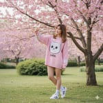 She wears a soft oversized pink sweater with dropped shoulders and striped sleeve ends. On the front of the sweater, there is a large cute cat illustration and a small text underneath that reads “SARA.” She wears no bottoms.