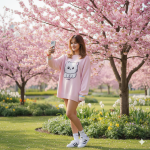 The photo is taken in the morning using natural light. The subject stands beside a cherry blossom tree or pink flowering tree, holding a phone as if taking a selfie, and gives a slight smile while turning toward the camera.