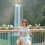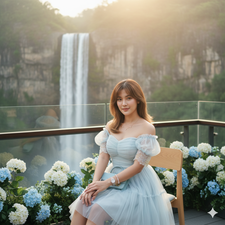 She is sitting on a chair on the balcony of a minimalist-style café. Behind her is a breathtaking view of a waterfall. The café is tucked away in a secluded corner, surrounded by blooming flowers along the edge of a steep cliff. The atmosphere feels serene and peaceful.