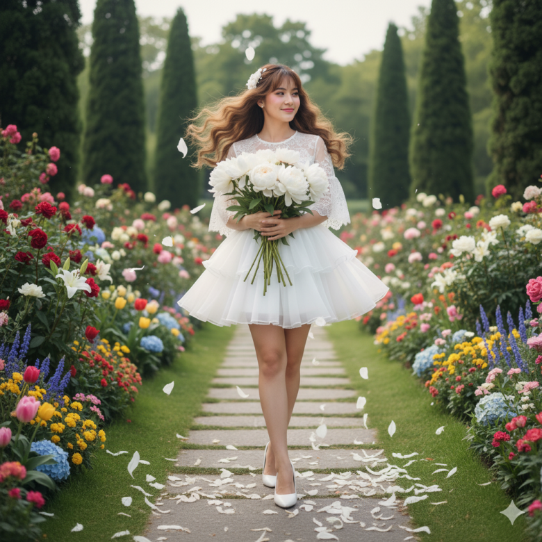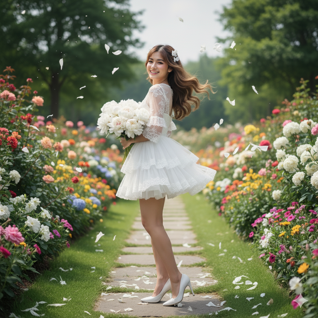 Make an ultra-realistic photo of myself, Full body. are beautiful to look at, she smiles, beautiful eyes, pink blush, curly eyelashes, pink lips with short straight shoulder length hair, small white hair clips, and hair fluttering in the wind. Wearing a short white gradient chiffon dress with tiered lace sheer sleeves, a tiered short skirt that flutters in the wind, white high heels, she holds a bouquet of white peonies with white petals flying around her and scattered below her. The background is a beautiful garden colorful flower garden with green grass, winding paths, tall green trees,