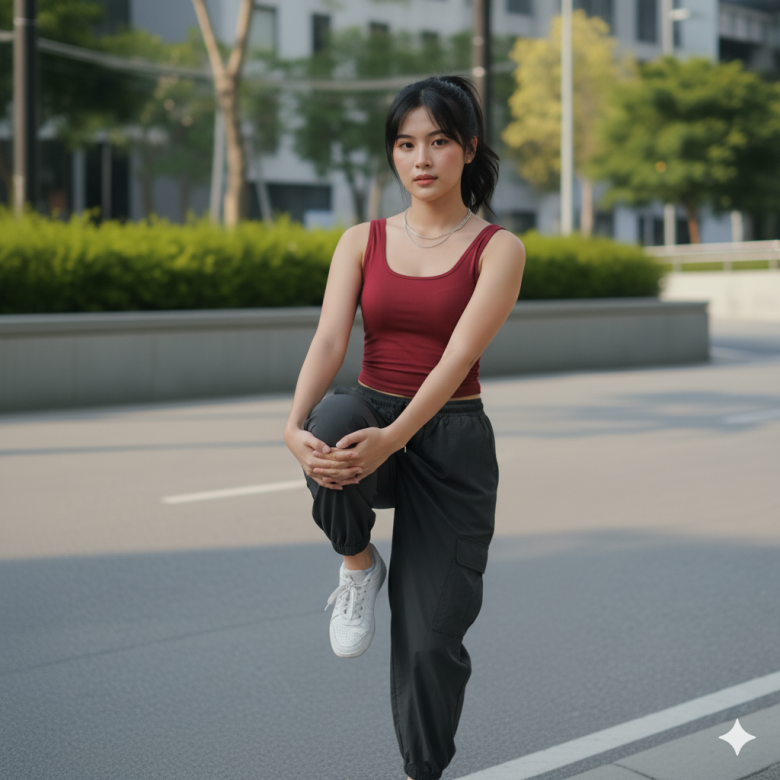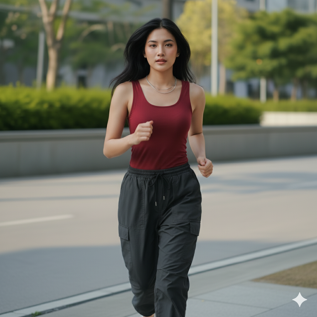 Using the exact facial features from this attached photo and hair shoulder-length wavy hair. Create a photo of a young woman standing outdoors with poised on the side of a road in warm golden afternoon sunlight, wearing a dark red form-fitted tank top, paired with loose low-waist light black drawstring cargo pants, with shoulder-length straight tousled black hair parted in the middle, subtle soft glam makeup with peach blush and glossy red lips, wearing a thin layered silver necklace, her pose relaxed with arms down by her sides, while looking at the camera with a calm neutral expression, behind her a lush green hedge and trees, modern exterior building and railings in the background, bright daylight casting soft shadows, clean street foreground, candid fashion street-style portrait, shot medium-framed waist-up, natural color grading, crisp sharp details, realistic photography.