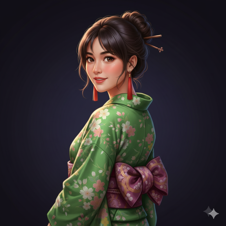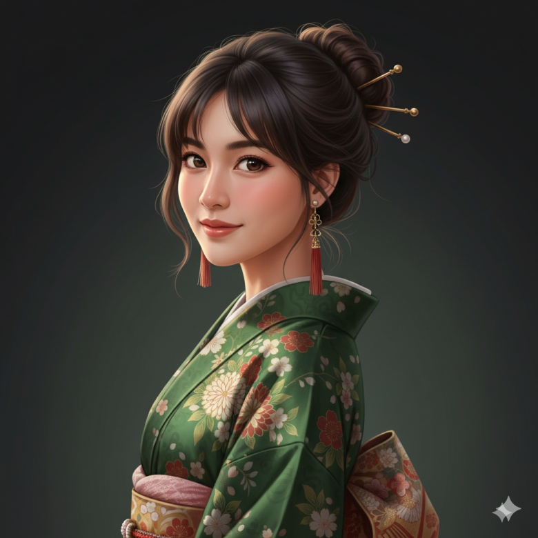 Semi‑realistic anime portrait of an adult woman in a green floral kimono and obi, bust‑up 3/4 view, looking back over shoulder, warm smile, subtle blush, glossy eyes, dark hair in messy bun with hair sticks, long tassel earrings, wide sleeves, finely detailed floral fabric, soft warm key light with rim light, shallow depth of field, dark gradient background, high detail, smooth painterly digital painting.