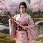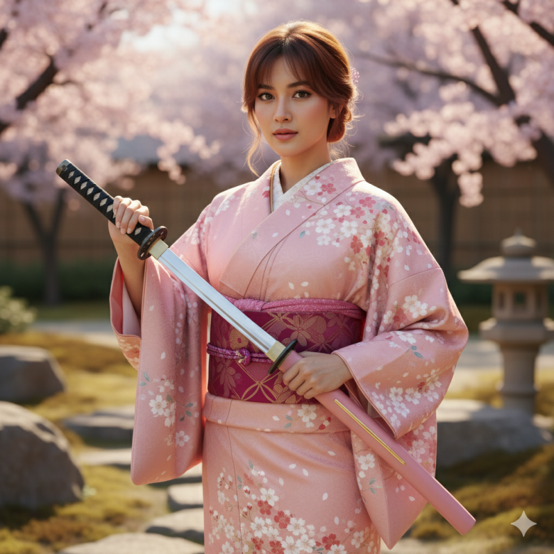 Create an ultra-realistic image of a woman standing outdoors, wearing a traditional pink Japanese kimono with sakura patterns and an obi. In her hands, she holds a long katana that is being sheathed in a pink scabbard with a straight gold line running from bottom to top, evoking a sense of strength and tradition. The woman radiates a powerful aura of confidence and elegance, blending traditional aesthetics with modern sensitivity.