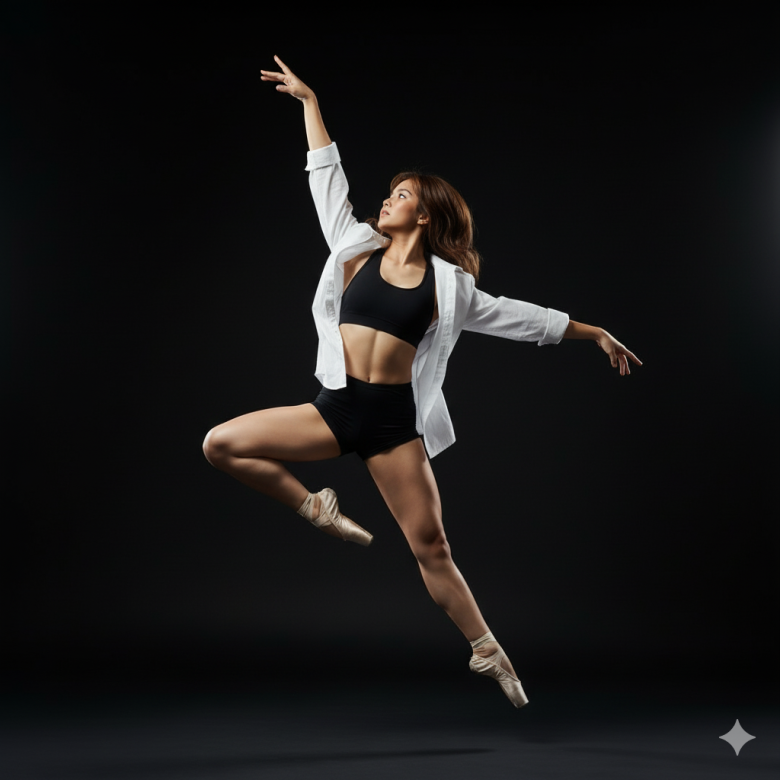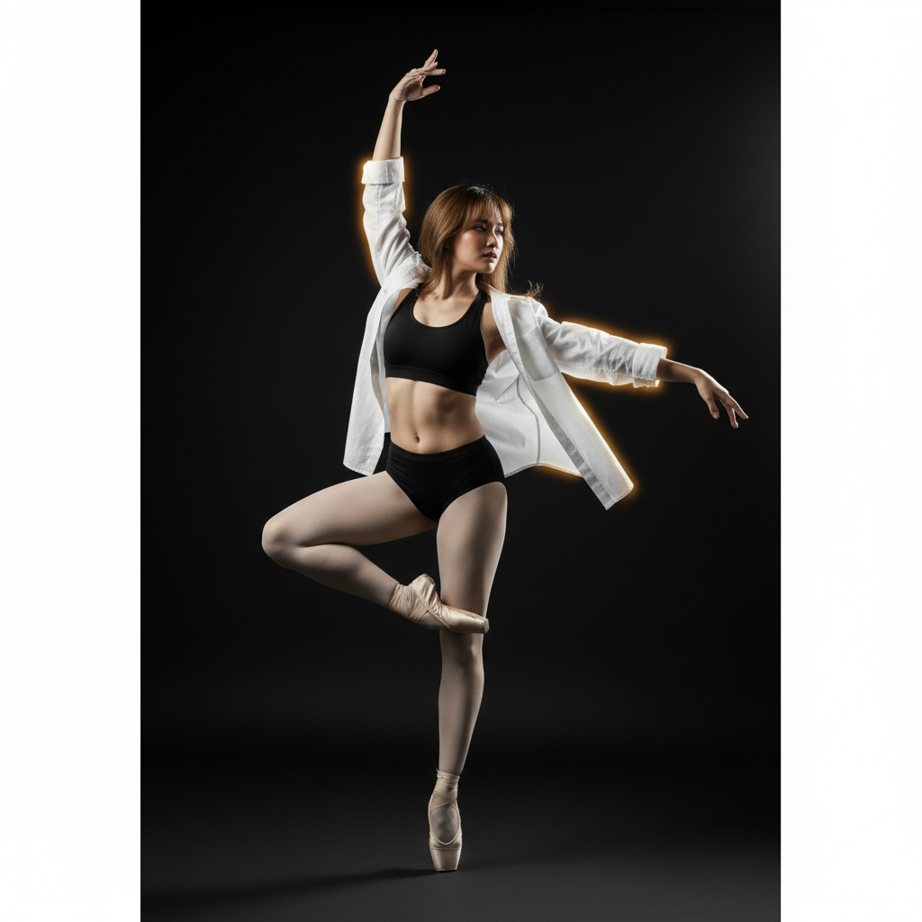Angle: Slightly low-angle, looking slightly upward to emphasize the dancer’s lift and elongation.