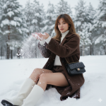Wearing a dark brown long coat, a white turtleneck, brown shorts, white boots, and a Chanel bag worn across the body, showing off beautiful slender legs. The background is in the middle of a beautiful snowy landscape. Sitting and posing on the snow, both hands holding and throwing snow. The background view is of pine trees covered in snow, giving a soft impression with highly realistic lighting and shadows.