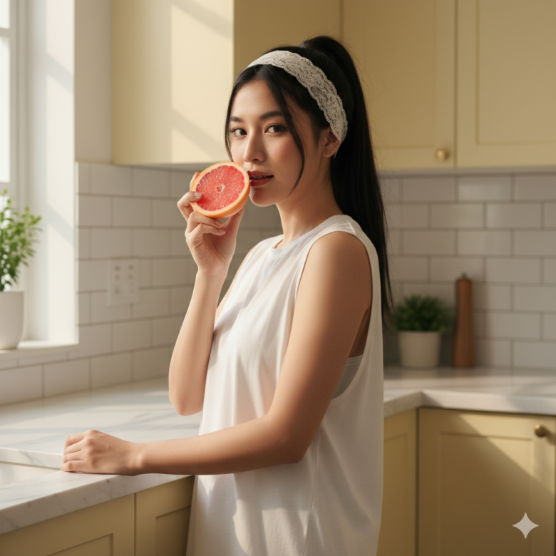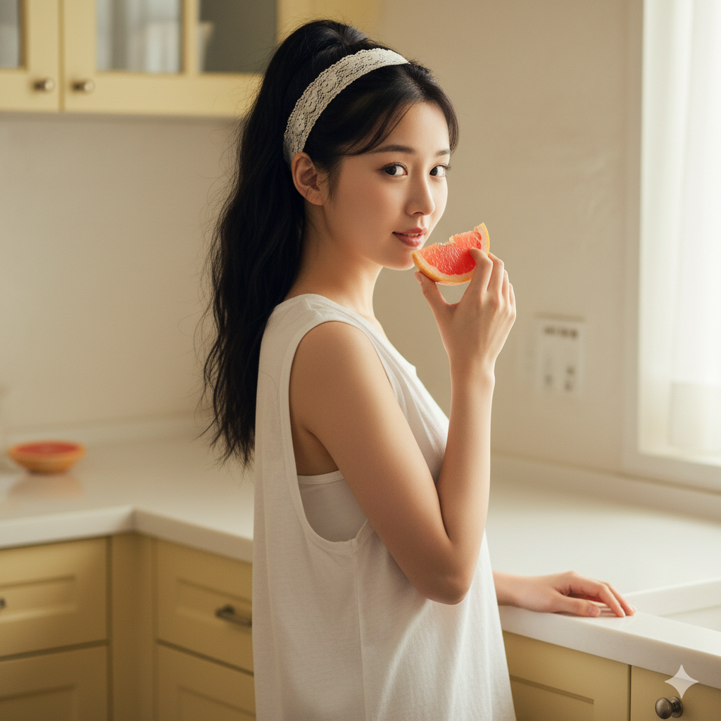 A realistic cinematic indoor portrait of a young woman standing beside a kitchen counter, gently holding a slice of grapefruit near her mouth. She has long black hair styled in a high ponytail tied with a white lace headband. She wears a loose, sleeveless white shirt made of soft cotton — light and casual, similar to an oversized tank top, draping naturally over her frame. The outfit gives a relaxed and simple look, matching the cozy home atmosphere.
