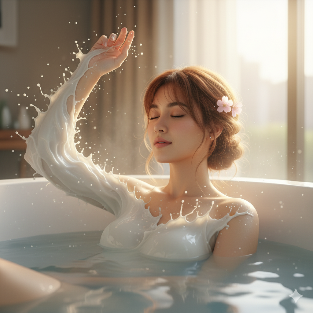 Extremely Detailed Outfit (Top/Bottom/Dress/Cargo): The model’s chest area is bare. This area is covered by a very dynamic splash of water in a cloudy white or milky transparent color (like spa water or bubbly/oily bath water). The water should appear as a high, dynamic splash, frozen in motion, forming an artistic layer that covers the entire chest area. The splash appears to blend with the water in the bathtub, demonstrating a natural color transition between the thick splash and the clearer/cloudy light blue water below. The splash effect should be realistic, with small, sharp water droplets scattered through the air, especially around the raised hand.
