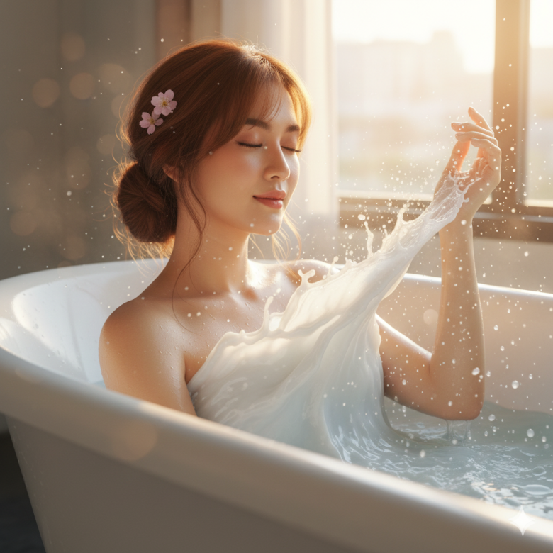 Body Movement & Pose: The model poses casually in a bathtub. Her upper body is slightly tilted to the side, giving the impression of relaxation. Her right arm is raised in the air with a splash of water, while her left arm is submerged in the water. Her head is slightly tilted to the right, and her eyes are closed, with a peaceful expression and a very soft, natural smile.