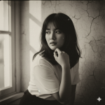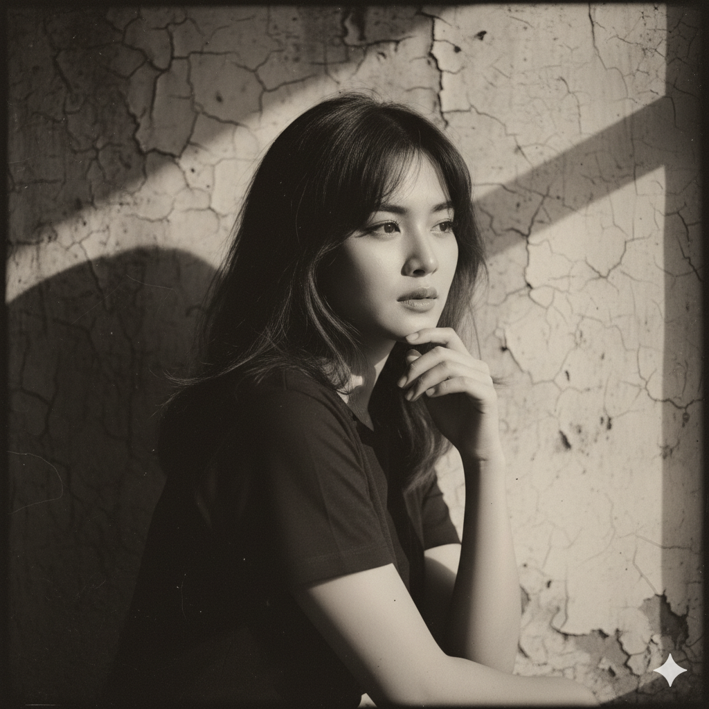 Background: An aged, textured wall with fine cracks, illuminated by antique soft sunlight streaming through a side window, casting delicate shadows on her face and the wall.