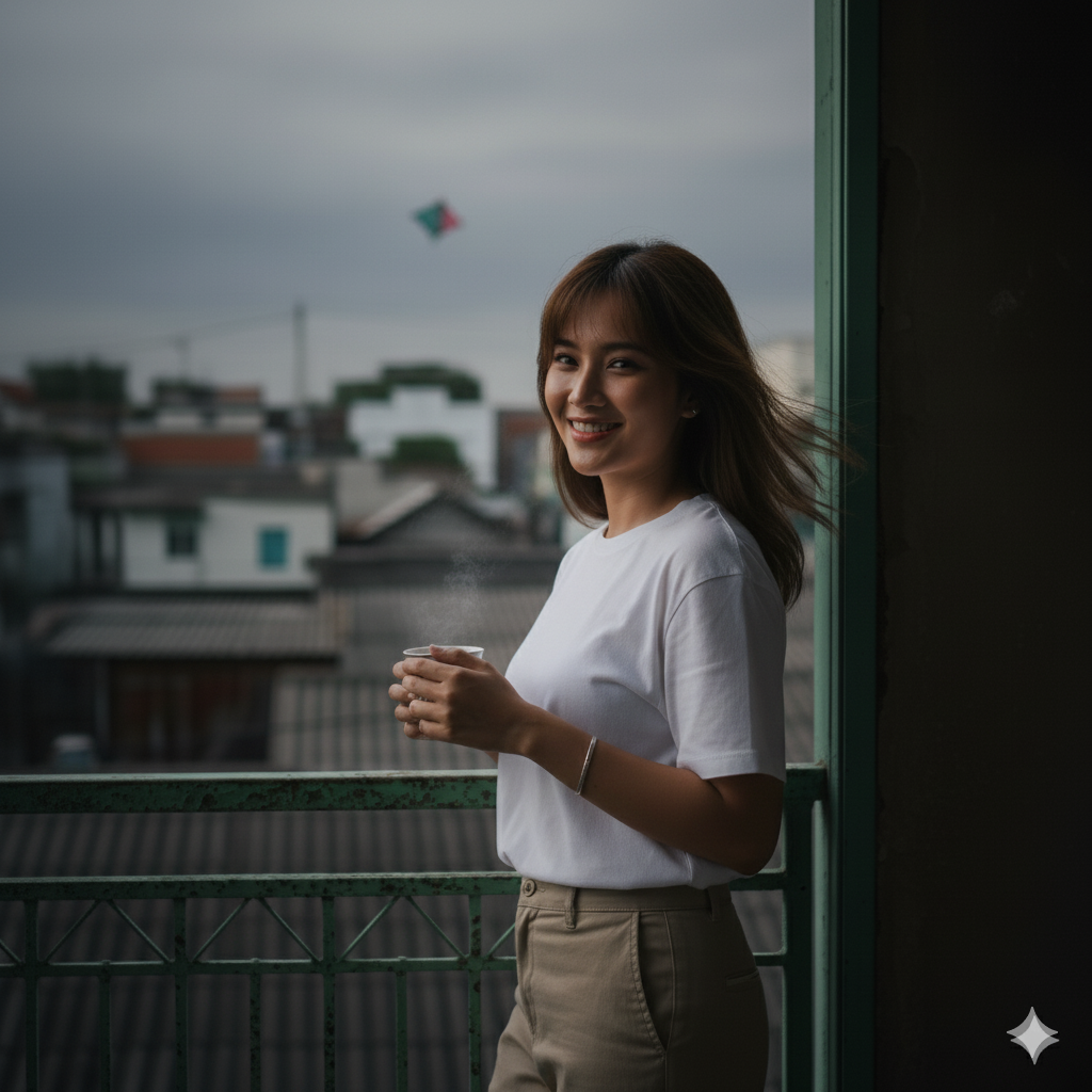 Create an ultra-realistic photo (using the attached image) of me standing outside a low balcony gate or doorway, with slightly faded green walls. The camera angle is balanced and slightly from the side. My body is leaning back slightly, with both arms resting on the low railing and both hands holding a cup of warm tea. My head is slightly tilted down and turned to the left (looking out of frame) with a gentle smile. I have long dark hair that appears to be blown softly by the wind. The photo is taken from a low angle, showing the subject from a full-body or medium distance, filling the central area of the frame.