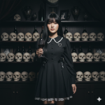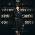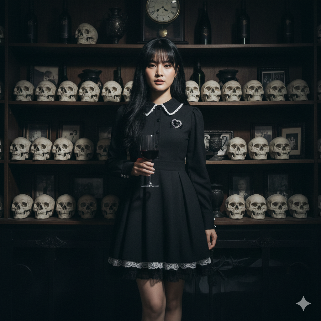 Background: A long dark wooden shelf stretches behind the model. The shelf is filled with numerous real human skulls of bone-white color, neatly arranged. The skulls are multiplied to fill almost the entire visible shelf area, creating a sense of an extensive collection and a dense gothic atmosphere. Among the skulls are several dark wine bottles, antique dark-colored vases or jars, and small picture frames with faint images inside, scattered between the skulls. At the very top of the shelf, part of an old wall clock with Roman numerals can be seen, adding a touch of aged time.