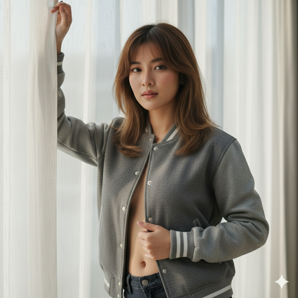 A realistic photo me wearing a casual gray varsity jacket no inner top near a softly lit window. The light passes through sheer curtains, creating a calm, natural morning atmosphere. Focus on realistic skin texture, soft shadows, and a serene, confident expression.”she was posing her hands up the curtain and right hand open wide on her jackets showing her stomach as a professional model.