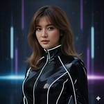 Ultra-realistic cinematic portrait of me, a 24-year-old girl wearing a sleek modern futuristic outfit in black with luminous silver-white glowing lines along the edges.
