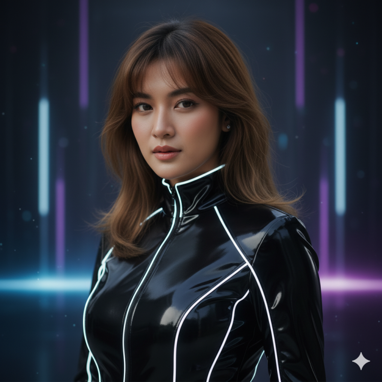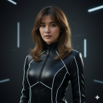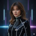 Ultra-realistic cinematic portrait of me, a 24-year-old girl wearing a sleek modern futuristic outfit in black with luminous silver-white glowing lines along the edges.